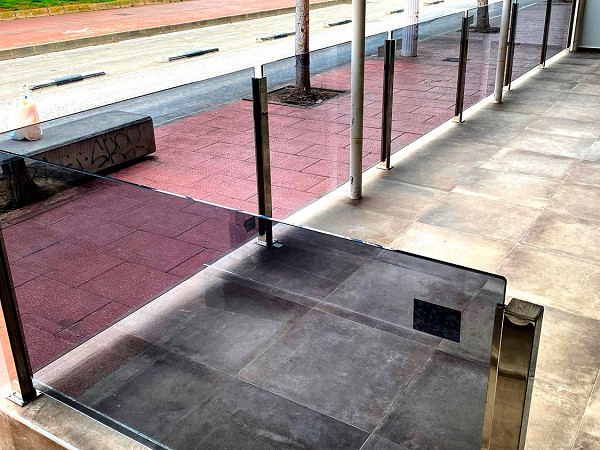 Barandilla de cristal con postes cuadrados de acero inoxidable y vidrio laminado 6+6 en tonalidad gris